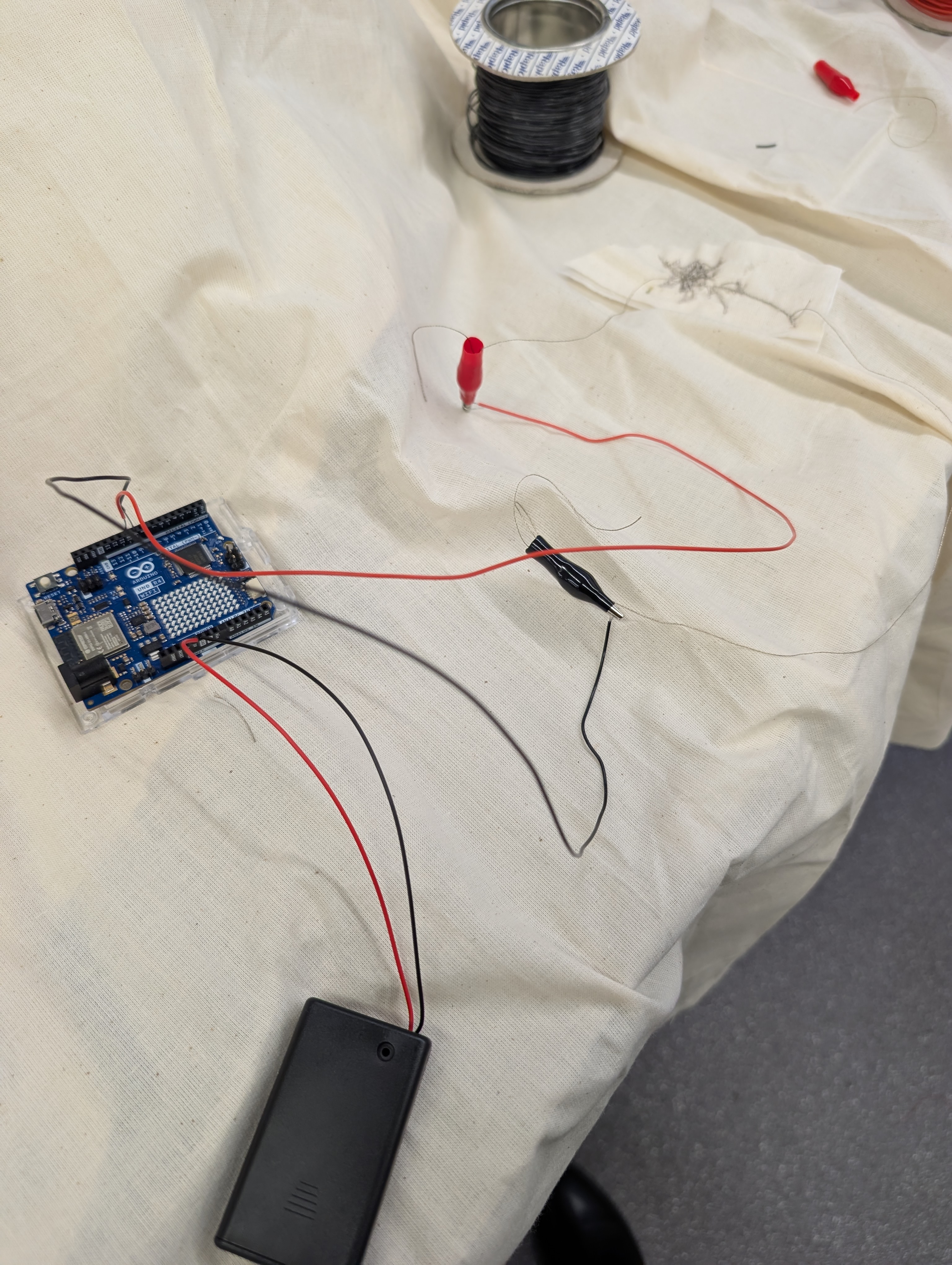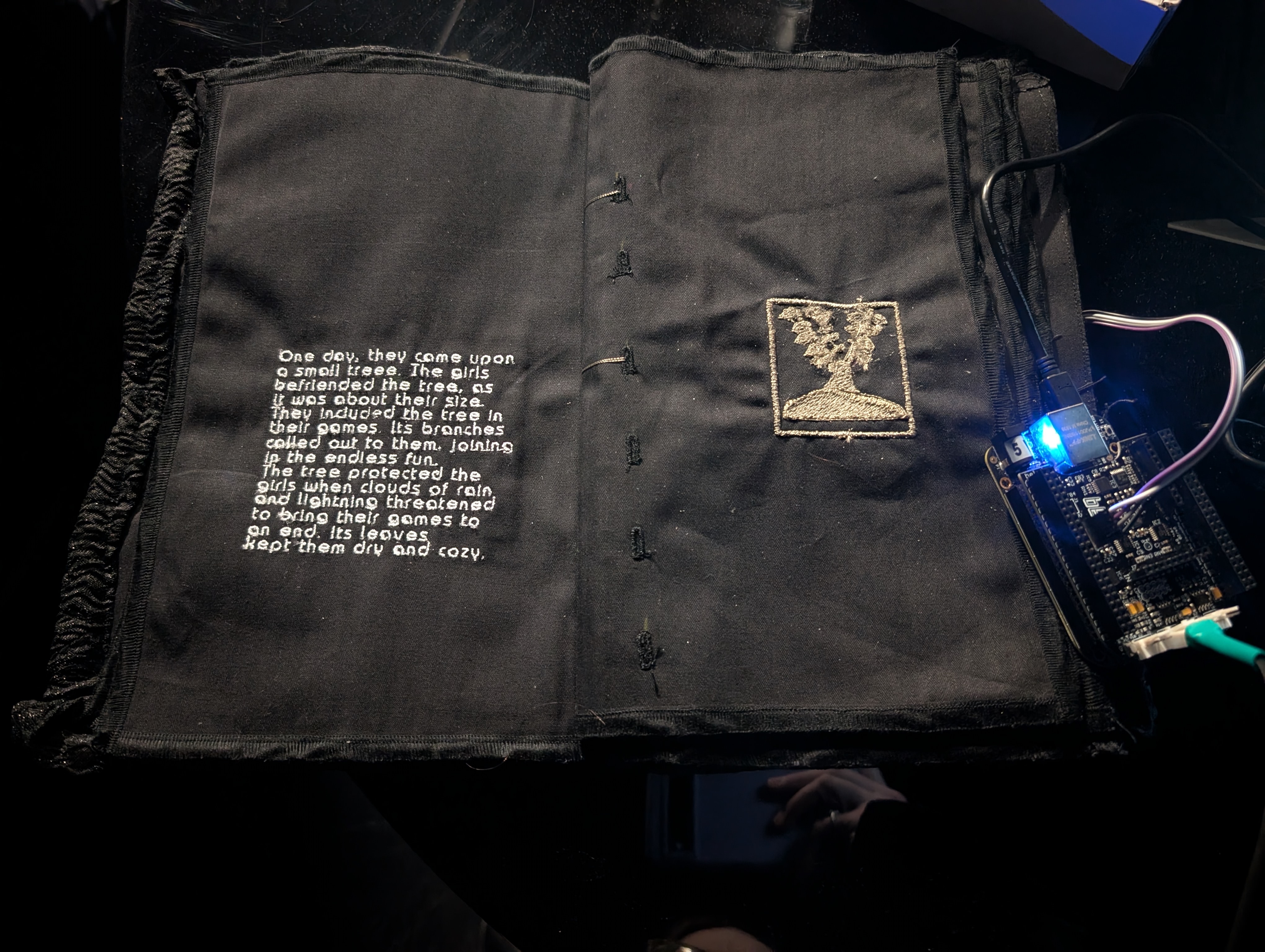 Based on my initial goals, the end product of this project was a success. It did produce ambient noise from three patches triggered within a book. I faced several challenges throughout the design process, but I was also able to succeed in using fabric and sewing techniques effectively. The largest challenge I faced was embroidering the conductive thread, which is much thicker than traditional thread, so machines struggle to embroider it correctly. I redesigned the sensors several times before one of the designs was completed. Through this process, I learned about how to optimise designs for embroidery machines.