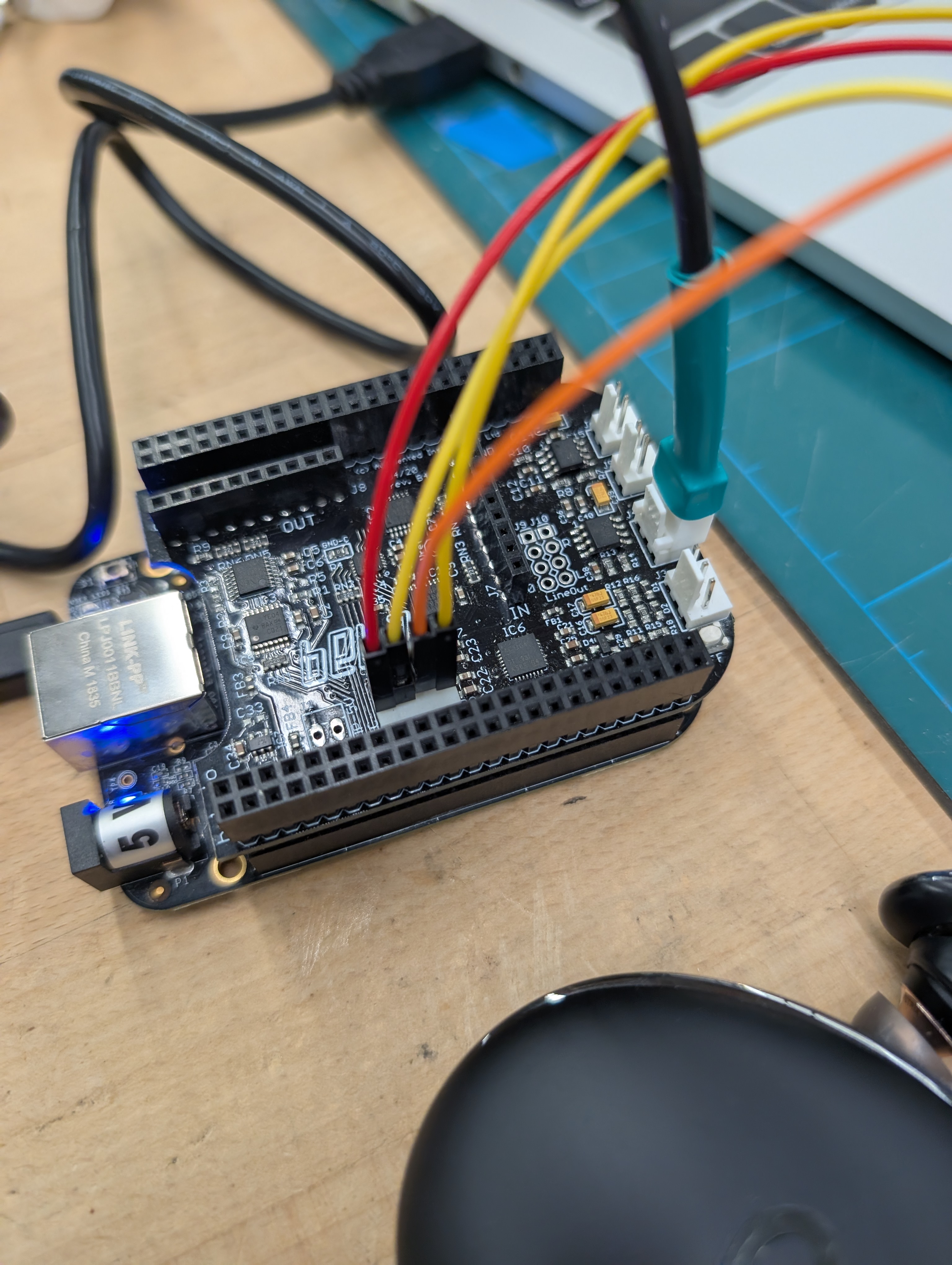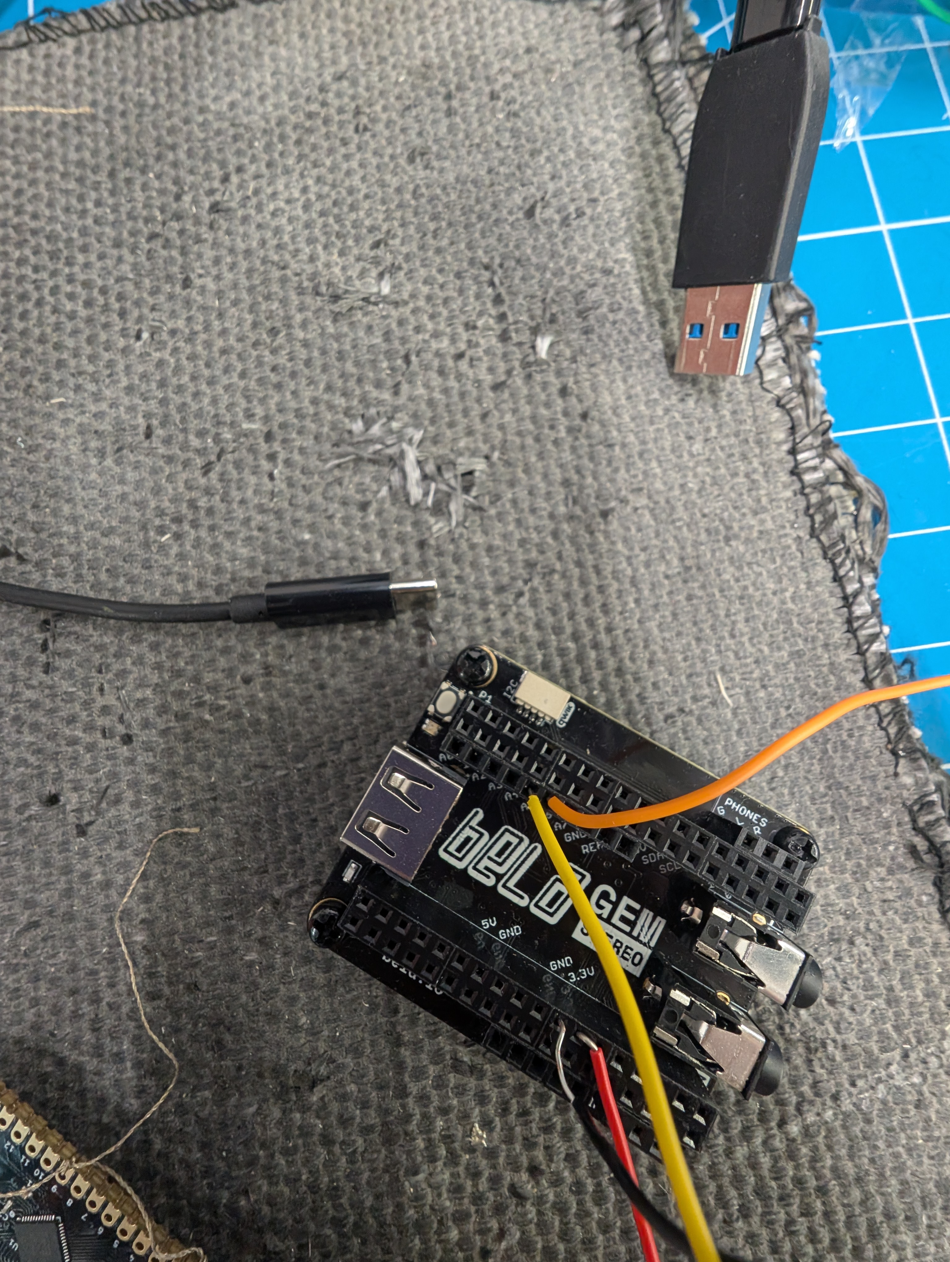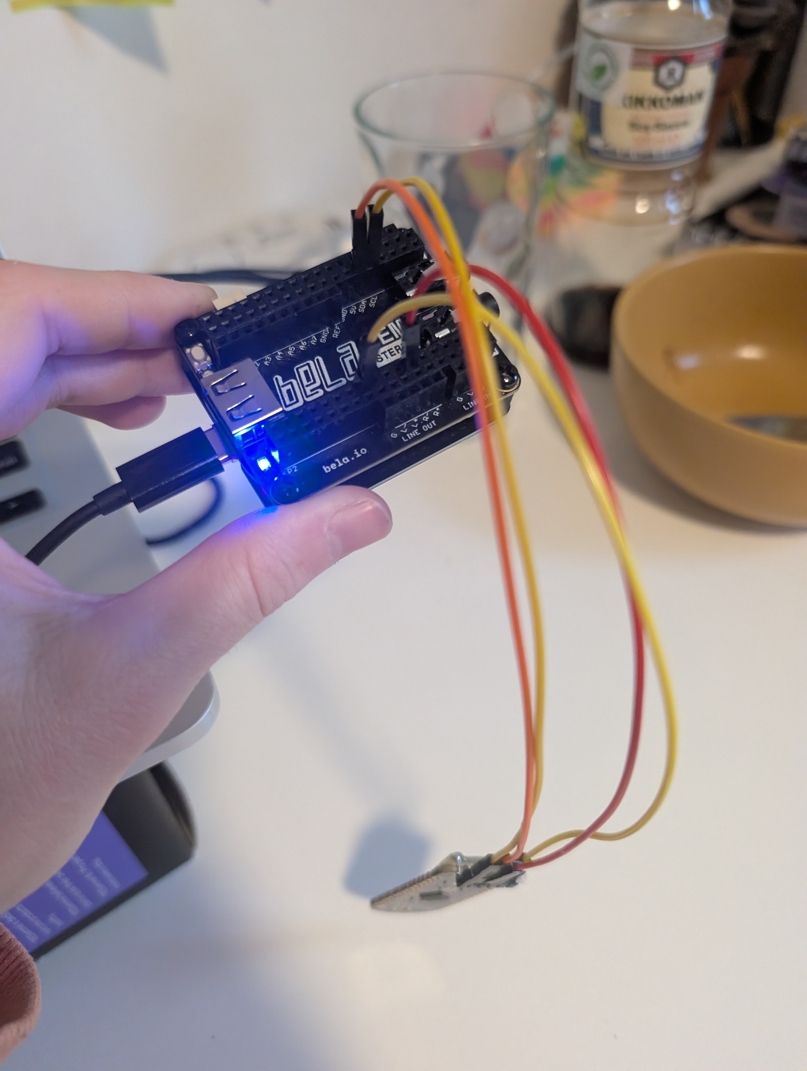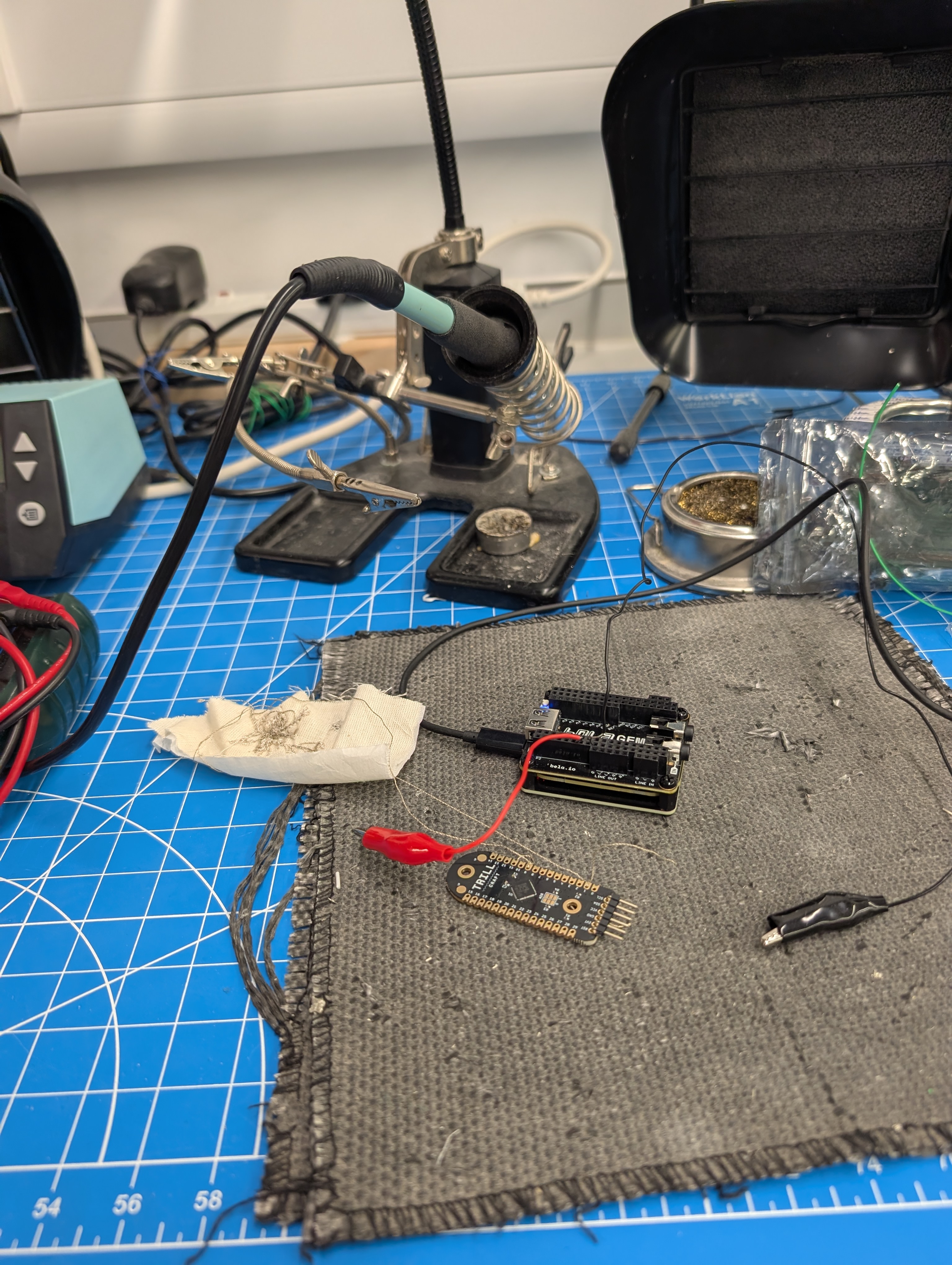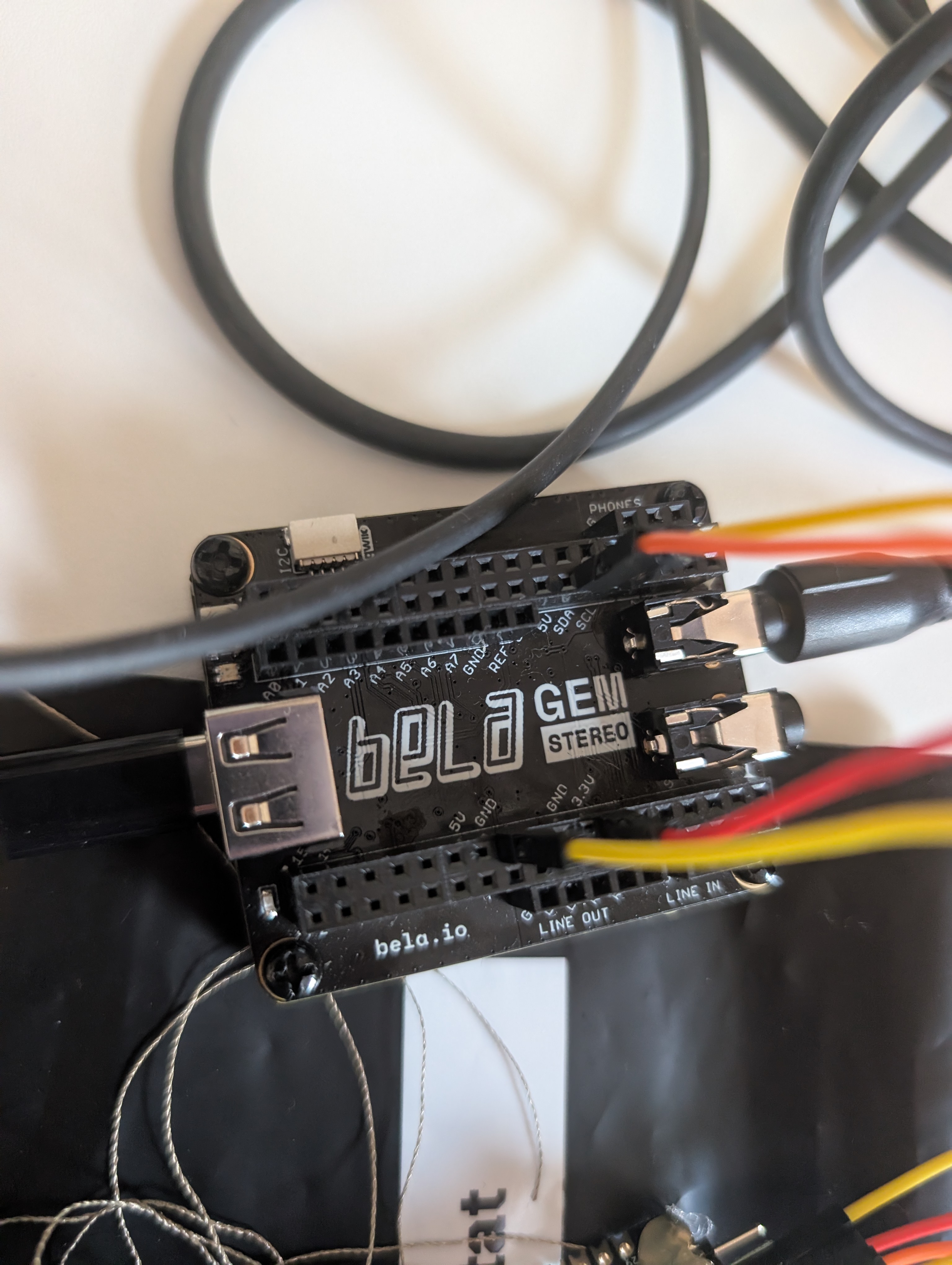 This image shows the testing of a single page and an extra sensor with the Trill Craft and Bela board.